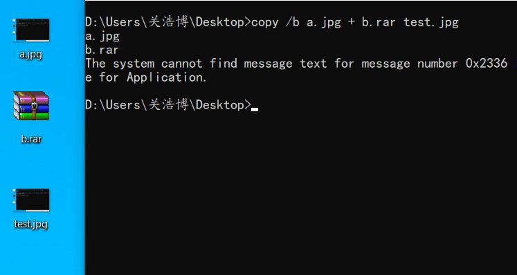 笔记 使用cmd合并文件 关浩博2019年11月26日 浏览量: 140 操作步骤 准备一张图片 a.jpg,一个压缩包 b.rar 在 cmd 中执行下列命令 copy /b a.jpg + b.rar test.jpg 将生成的 test.jpg 的扩展名改为 rar,即可看到放在 rar 中的文件。 大家可以下载这张图片,修改扩展名为 rar,看看里面有什么:smirk: