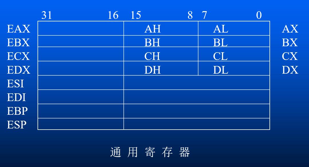 H是HIGH的缩写,L是LOW的缩写,AH为高八位寄存器,AL为低八位寄存器。AH和AL合在一起是16位寄存器AX,在AX高位扩展16位可以得到32位寄存器EAX。后面的B,C,D与A同理。