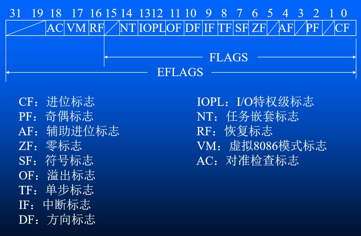 包括16位标志寄存器FLAGS和32位标志寄存器EFLAGS,存放运算结果的属性。