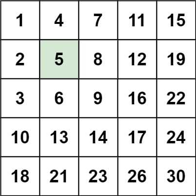 输入:matrix = [[1,4,7,11,15],[2,5,8,12,19],[3,6,9,16,22],[10,13,14,17,24],[18,21,23,26,30]], target = 5
